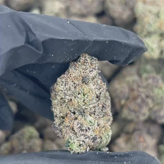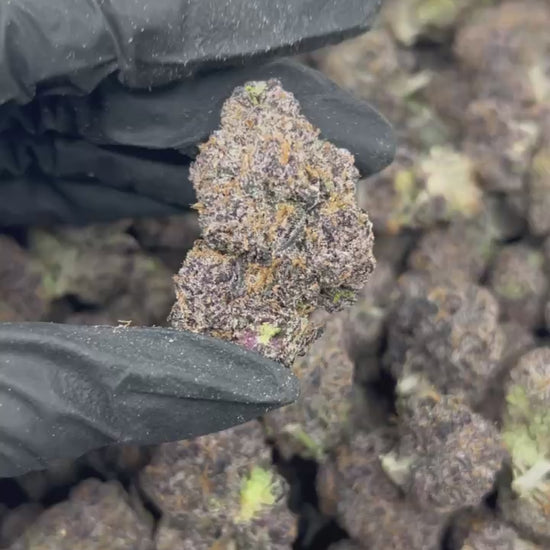 🔹 Bud Structure: Dense, dark purple buds with crimson pistils and heavy frost