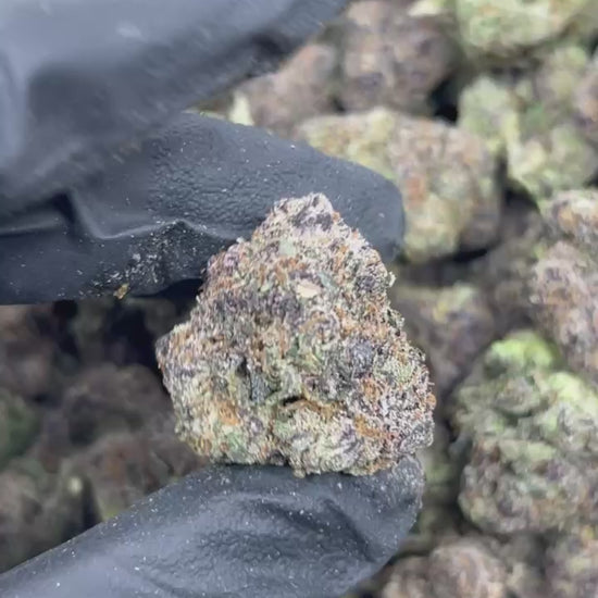 🔹 Bud Structure: Dense, chunky buds with purple and blue coloration